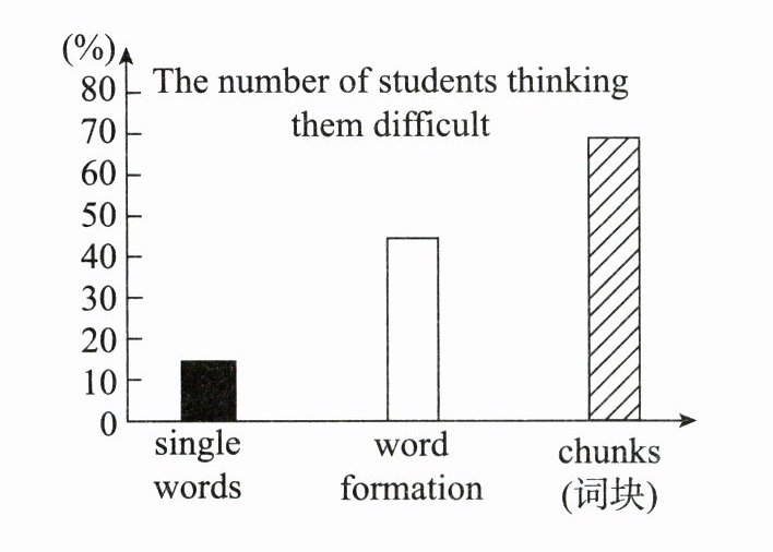 (描述调查结果)Last week, I conducted a survey on the difficulty degree of memorizing vocabulary. The result reveals some striking statistics. As you can see, about 45% of students consider it is difficult to memorize word formation. Chunks dominate the result, with an astonishing 70% of students opting for them, while single words are the least favored, chosen by only 15% of the participants(过去分词短语作后置定语)①.