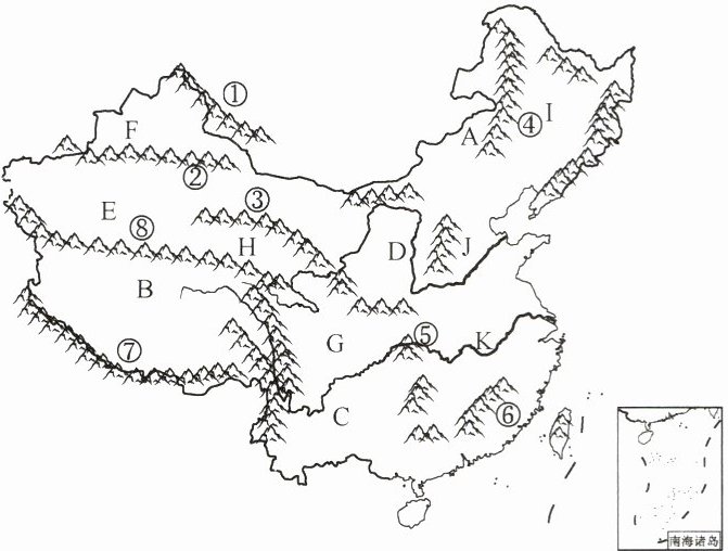 (7)山脉⑧是____,其与③山脉之间的地形区H是____。
