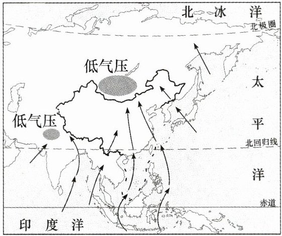 10. 读“我国某季节季风示意图”,回答有关问题。