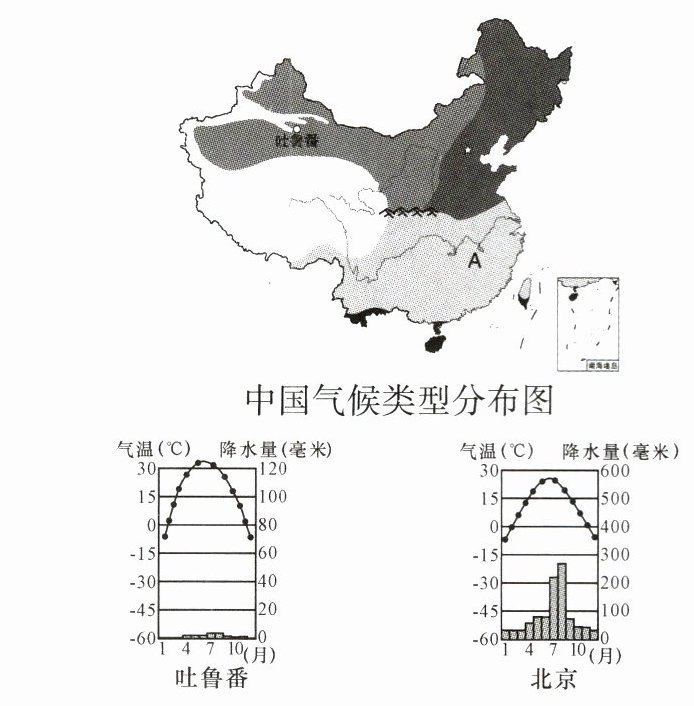 (3)图中北京______两个月份降水最多,北京的年降水量比吐鲁番______(选填“多”或“少”),造成两地降水差异的最主要因素是____________(选填“纬度位置”“海陆位置”或“地形”)。