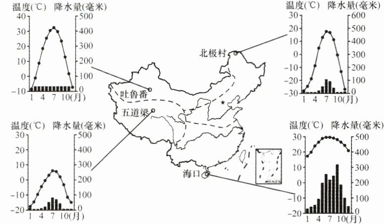 5.(昆明西山区期中)如图是海口、吐鲁番、北极村、五道梁的年内各月的气温和降水量柱状图。关于四地气候类型特点的叙述不正确的是 ( )
