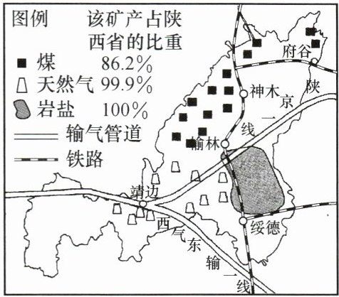 陕西榆林市位于陕西省最北部,煤炭、石油、天然气、岩盐等能源矿产资源富集一地,是我国国家级能源化工基地。读“榆林市矿产资源分布图”,完成6~7题。