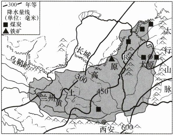 9.读“黄土高原位置和年降水量分布示意图”,回答下列问题。