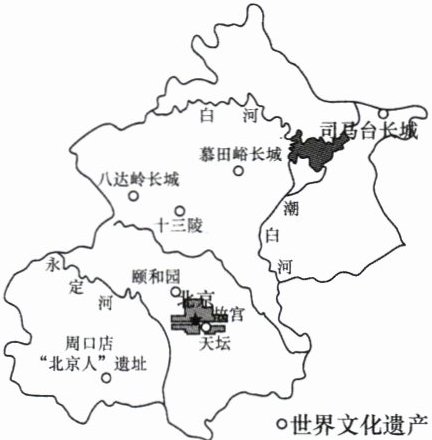 北京是世界上拥有世界文化遗产最多的城市。读“北京世界文化遗产分布图”,完成7~8题。