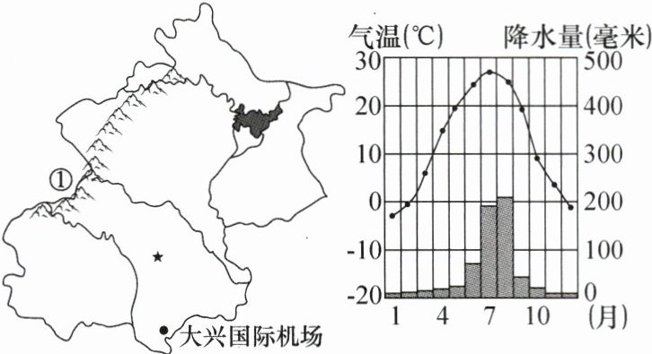 11. 读“北京市简图”和“北京市气温曲线和降水量柱状图”,回答下列问题。