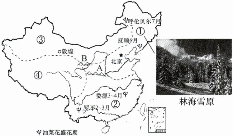 (5)油菜在我国广泛种植,但主要集中分布在图中的区域丁(填序号)。油菜花海已成为各地的特色旅游资源,从图中可看出,四地油菜花盛花期不同,造成这种差异的主要影响因素是