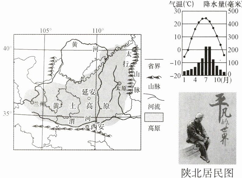 (昆明禄劝县一模)“在漫长的二三百万年间,这片广袤的土地已经被水流剥蚀的沟壑纵横、支离破碎、四分五裂,像老年人的一张粗糙的脸。”(摘自路遥《平凡的世界》)如图为我国黄土高原略图、延安气温曲线和降水量柱状图及陕北居民图。读图,完成1~2题。