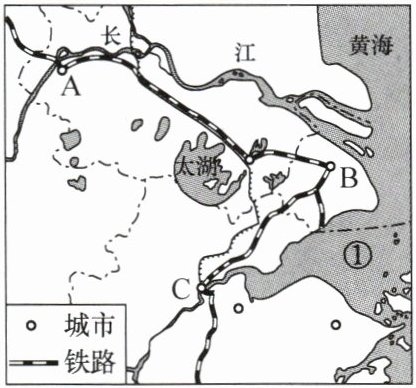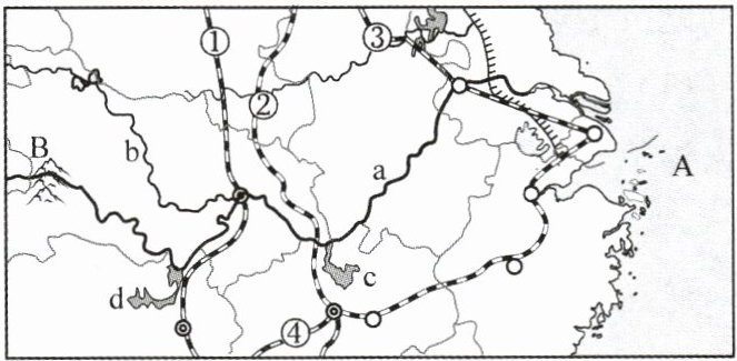 (3)该区域交通便利,有①______铁路、②______铁路、③______铁路、④______铁路,与“黄金水道”a______共同构成便利的交通网。