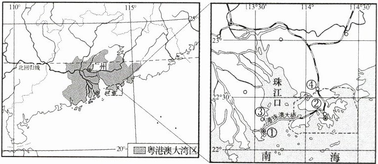 A. ①—香港 B. ②—澳门 C. ③—广州 D. ④—深圳