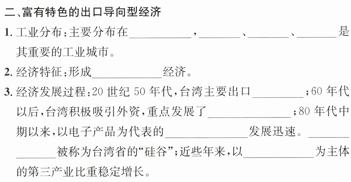 一、1.(1)珠江口东侧 香港岛 九龙 新界 (2)金融 服务业 世界第三大金融中心 东方之珠 美食天堂 购物者天堂 2.(1)珠江口西侧 澳门半岛 氹仔岛 路环岛 (2)规模最大 保存最完整 (3)旅游博彩业