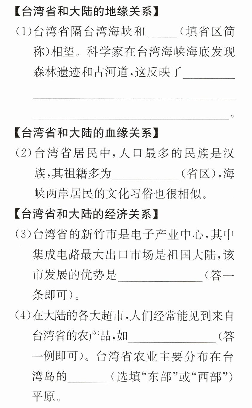 (1) 闽 台湾海峡曾经是陆地,台湾岛和大陆相连;台湾与我国大陆有密切的地缘关系
