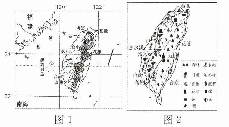 16.(昭通模拟)台湾省的发展离不开祖国大陆市场。图1是“台湾省地图”,图2是“台湾省物产分布图”。结合图文资料,完成下列问题。