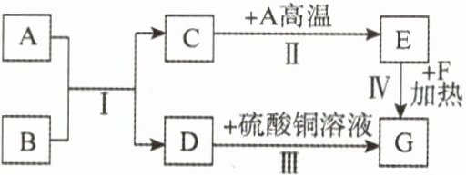 11.A~G是初中化学常见的物质。已知A为黑色固体单质,B为红棕色粉末,G为紫红色固体单质,它们的转化关系如图所示,回答问题。