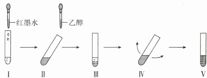 6.在盛有2 mL水的试管中滴入2~3滴红墨水,振荡,然后将试管倾斜,用滴管沿试管内壁缓缓加入约2 mL乙醇,不要振荡,慢慢直立试管观察现象,然后振荡并静置几分钟,观察现象。