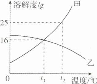 (2)$t_2$℃时甲物质的饱和溶液中溶质的质量分数为______;将$t_2$℃时甲、乙两种物质的饱和溶液分别降温至$t_1$℃,溶液中溶质质量分数大小关系是:甲______(填“<”“=”或“>”)乙。