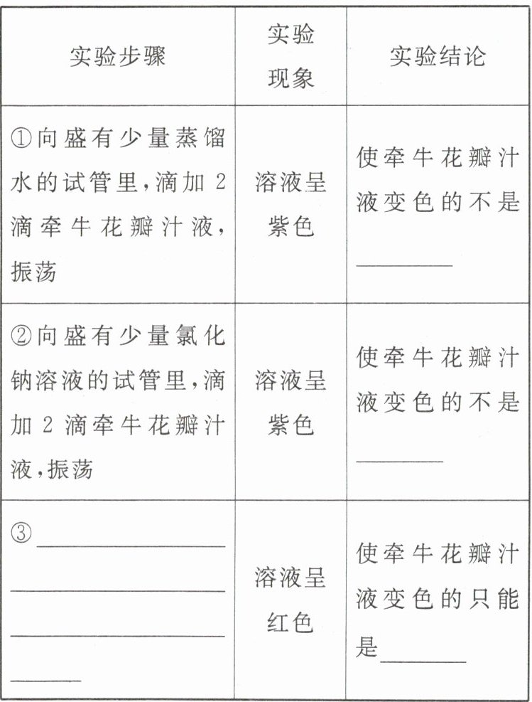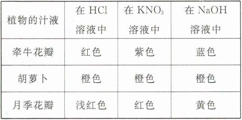 5. 某同学将一朵紫色牵牛花泡在石灰水中,牵牛花很快就变成了蓝色,又将一朵紫色牵牛花泡在稀盐酸中,牵牛花很快就变成了红色,请你根据以上实验现象回答下列问题。