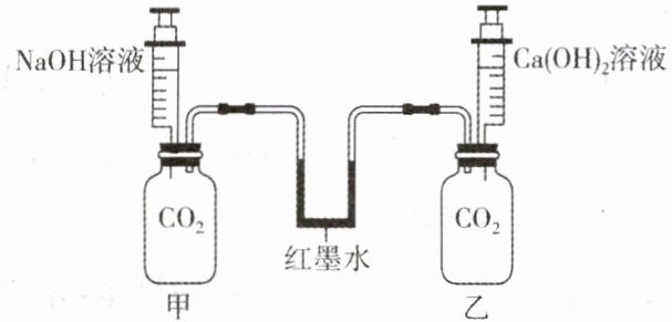 CO2与NaOH、Ca(OH)2都能发生反应。分别向甲、乙两个瓶中注入少量、等体积的两种溶液,观察实验现象。