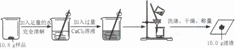 (3)解:设10.8g样品中碳酸钠的质量为x。$CaCl_{2}+Na_{2}CO_{3}=CaCO_{3}\downarrow +2NaCl$ 106 100 x 10.0 g $\frac{106}{100}=\frac{x}{10.0g}$ 解得:$x = 10.6g$ 样品中碳酸钠的质量分数为:$\frac{10.6g}{10.8g}\times100\% = 98.1\%>98.0\%$ 答:该工业纯碱为合格品。
