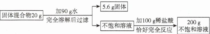(2)解:设生成氯化钠的质量为x。$Na_{2}CO_{3}+2HCl=2NaCl+H_{2}O+CO_{2}\uparrow$ 117 44 x 4.4 g $\frac{117}{44}=\frac{x}{4.4g}$ 解得:$x = 11.7g$ 溶质质量分数:$\frac{11.7g + 20g - 5.6g - 10.6g}{200g}\times100\% = 7.75\%$ 答:所得不饱和溶液的溶质质量分数为7.75%。