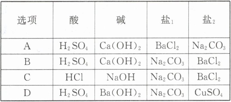 7. 右图表示相连线的酸、碱、盐之间可以发生复分解反应,下表提供的四组物质符合右图要求的是 ( )