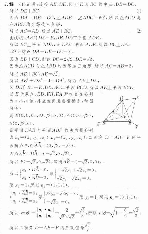 (2)点F满足$\overrightarrow{EF}=\overrightarrow{DA}$,求二面角D - AB - F的正弦值.