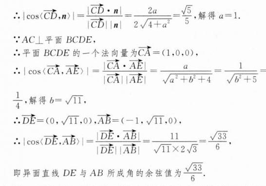 (2)若平面$ADE$与平面$ABC$夹角的余弦值是$\frac{\sqrt{5}}{5}$,且直线$AE$与平面$BCDE$所成角的正弦值是$\frac{1}{4}$,求异面直线$DE$与$AB$所成角的余弦值.