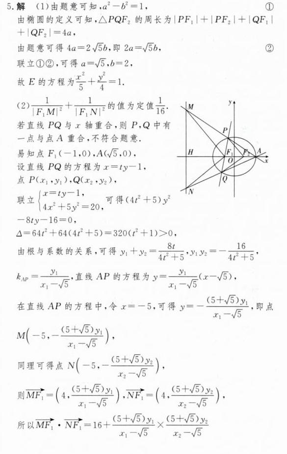 5.(2023·江西赣抚吉十一校联盟体高三下4月联考)已知点$A$是椭圆$E:\frac{x^2}{a^2}+\frac{y^2}{b^2}=1(a>b>0)$的右顶点,$F_1(-1,0)$,$F_2(1,0)$分别为$E$的左、右焦点,过$F_1$的直线与$E$交于$P$,$Q$两点(均与点$A$不重合),$\triangle PQF_2$的周长等于$E$的短轴长的$\sqrt{5}$倍。