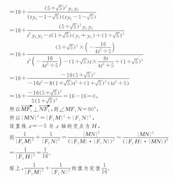 (2)若直线$AP$,$AQ$与直线$x = - 5$分别交于点$M$,$N$,则$\frac{1}{|F_1M|^2}+\frac{1}{|F_1N|^2}$的值是否为定值?若是,求出该定值;若不是,求出其取值范围。