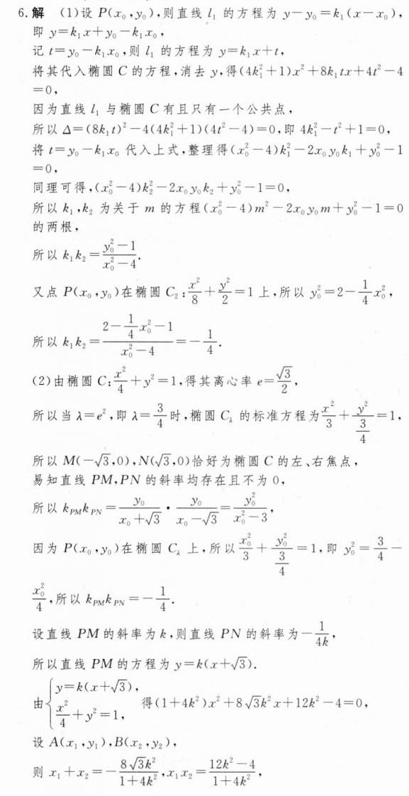 6.(2023·河南安阳一中、鹤壁高中、新乡一中高三下联考)定义:一般地,当$\lambda>0$且$\lambda\neq1$时,我们把方程$\frac{x^2}{a^2}+\frac{y^2}{b^2}=\lambda(a>b>0)$表示的椭圆$C_{\lambda}$称为椭圆$\frac{x^2}{a^2}+\frac{y^2}{b^2}=1(a>b>0)$的相似椭圆。已知椭圆$C:\frac{x^2}{4}+y^2=1$,椭圆$C_{\lambda}(\lambda>0$且$\lambda\neq1)$是椭圆$C$的相似椭圆,点$P$为椭圆$C_{\lambda}$上异于其左、右顶点$M$,$N$的任意一点。