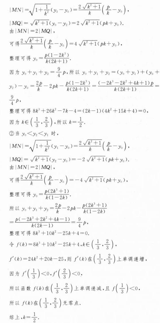 (2)若直线$l_{1}$的斜率$k\in(\frac{1}{3},\frac{2}{3})$,过点$M$作直线$l_{1}$的垂线$l_{2}$交抛物线$C$于另外一点$Q$,当$|MN| = 2|MQ|$,且$\triangle MNQ$的重心落在直线$y=\frac{3}{4}p$上时,求直线$l_{1}$的斜率。