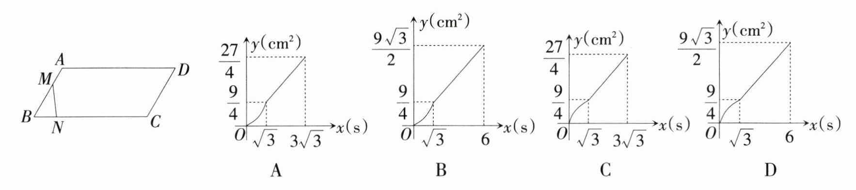 7. 〔朝霞原创〕如图所示,在平行四边形$ABCD$中,$AB = 3\ cm$,$BC = 6\ cm$,$\angle B = 60^{\circ}$,点$M$,$N$同时从点$B$出发,点$M$以$\sqrt{3}\ cm/s$的速度沿$B→A→D$运动,点$N$以$1\ cm/s$的速度沿$B→C$运动,当其中一点到达终点时,另一点也随之停止运动. 若$\triangle BMN$的面积为$y(cm^{2})$,运动时间为$x(s)$,则能够反映$y$与$x$之间函数关系的图象大致是 ( )