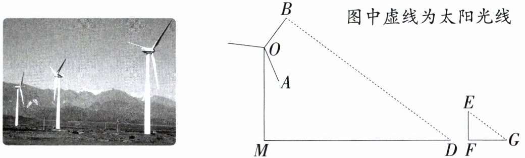 22. (10分)风力发电是风靡全球的自然能源应用绿色设备,在我国应用广泛. 如图是某风力发电设备示意图,其相同的三个叶片均匀分布($\angle AOB = 120^{\circ}$),水平地面上的点$M$在旋转中心$O$的正下方. 某一时刻,太阳光线恰好与扇叶$OA$,$OB$在同一平面上,在地上设置3 m高的标杆$EF$影长$FG = 4$ m. 此时太阳光垂直照射叶片$OB$,整个风力发电设备的影子$MD$最长达到120 m. 已知风力发电杆高$OM$为60 m,求扇叶$OB$的长和此时点$B$到地面的距离.