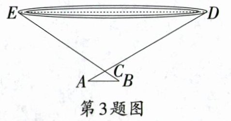 3. 如图所示,为了测量一池塘的宽DE,在岸边找到一点C,测得CD = 30 m,在DC的延长线上找一点A,测得AC = 5 m,过点A作AB//DE交EC的延长线于点B,测得AB = 8 m,则池塘的宽DE为 ( )