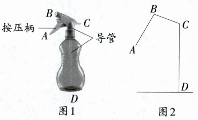 20. (9分)在学习过《解直角三角形》一章的知识后,九年级某班的同学们为了巩固学习成果,就地取材,利用所学的数学知识解决身边的问题. 如图1所示是教室内一只消毒用的酒精喷雾瓶的实物图,其示意图如图2所示,AB = 5 cm,BC = 4 cm,∠ABC = 100°,∠BCD = 110°. 求按压柄下端A到导管CD的距离.