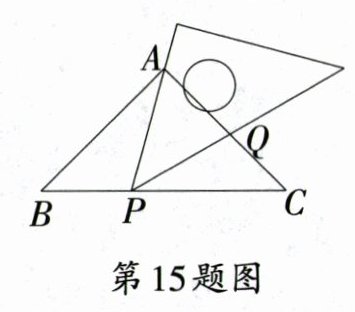 15. 如图,在等腰直角三角形ABC中,$\angle BAC = 90^{\circ}$,AB = AC = 2,直角三角尺含45°角的顶点P在边BC上移动(点P不与B,C重合),直角三角尺的一条直角边始终经过点A,斜边与边AC交于点Q。当△ABP为等腰三角形时,CQ的长为_______.
