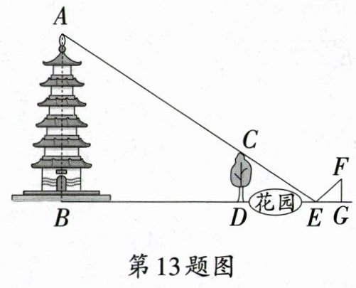 13. 如图,某古塔前有一棵高4 m的小树CD,发现水平地面上点E、树顶C和塔顶A恰好在一条直线上,测得BD = 57 m,D,E之间有一个花园距离无法测量;然后,在E处放置一平面镜,沿BE后退,退到G处恰好在平面镜中看到树顶C的像,EG = 2.4 m,测量者眼睛到地面的距离FG为1.6 m。已知$AB\perp BG$,$CD\perp BG$,$FG\perp BG$,点B,D,E,G在同一水平线上,则该古塔的高度AB为_______m.