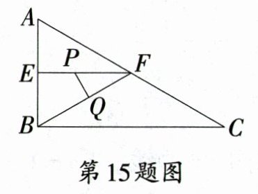 15. 如图,在$Rt\triangle ABC$中,$\angle ABC = 90^{\circ}$,$\angle ACB = 30^{\circ}$,$AB = 2\text{ cm}$,$E,F$分别是$AB,AC$的中点,动点$P$从点$E$出发,沿$EF$方向匀速运动,速度为$1\text{ cm/s}$,同时动点$Q$从点$B$出发,沿$BF$方向匀速运动,速度为$2\text{ cm/s}$,连结$PQ$. 设运动时间为$t\text{ s}(0<t<1)$,则当$t =$____________时,$\triangle PQF$为等腰三角形.