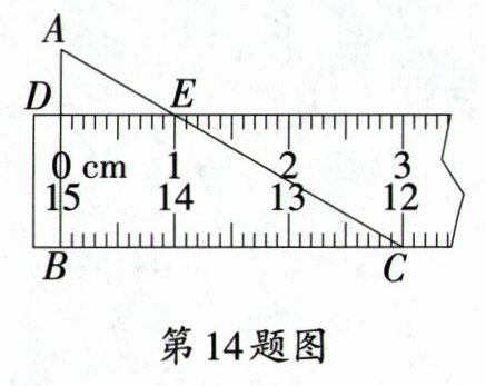 14. 如图,在$\triangle ABC$中,$\angle ABC = 90^{\circ}$,$\angle A = 60^{\circ}$,直尺的一边与$BC$重合,另一边分别交$AB$,$AC$于点$D$,$E$. 点$B$,$C$,$D$,$E$处的读数分别为15,12,0,1,则直尺宽$BD$的长为________.