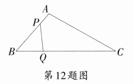 12.〔濮阳市〕如图,在$\triangle ABC$中,$AB = 10\mathrm{cm},BC = 20\mathrm{cm}$,点$P$从点$A$开始沿$AB$边向点$B$以$1\mathrm{cm/s}$的速度移动,点$Q$从点$B$开始沿$BC$边向点$C$以$2\mathrm{cm/s}$的速度移动。如果点$P,Q$分别从点$A,B$同时出发,那么经过______$\mathrm{s}$时,以$B,P,Q$为顶点的三角形与$\triangle ABC$相似。