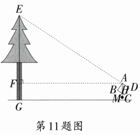 11.〔河南中考改编〕综合实践活动中,某小组用木板自制了一个测高仪测量树高,测高仪$ABCD$为正方形,$AB = 30\mathrm{cm}$,顶点$A$处挂了一个铅锤$M$。如图是测量树高的示意图,测高仪上的点$D,A$与树顶$E$在一条直线上,铅垂线$AM$交$BC$于点$H$。经测量,点$A$距地面$1.8\mathrm{m}$,到树$EG$的距离$AF = 11\mathrm{m}$,$BH = 20\mathrm{cm}$。则树$EG$的高度为______$\mathrm{m}$。(结果精确到$0.1\mathrm{m}$)