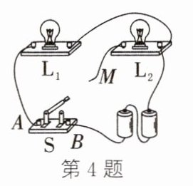 4.如图所示,某同学要连接由L₁和L₂组成的并联电路。若开关S要同时控制两盏灯,则应将导线M端接到图中________点;若开关S只控制L₁,则导线的M端应该接到图中的________点。(填“A”或“B”)