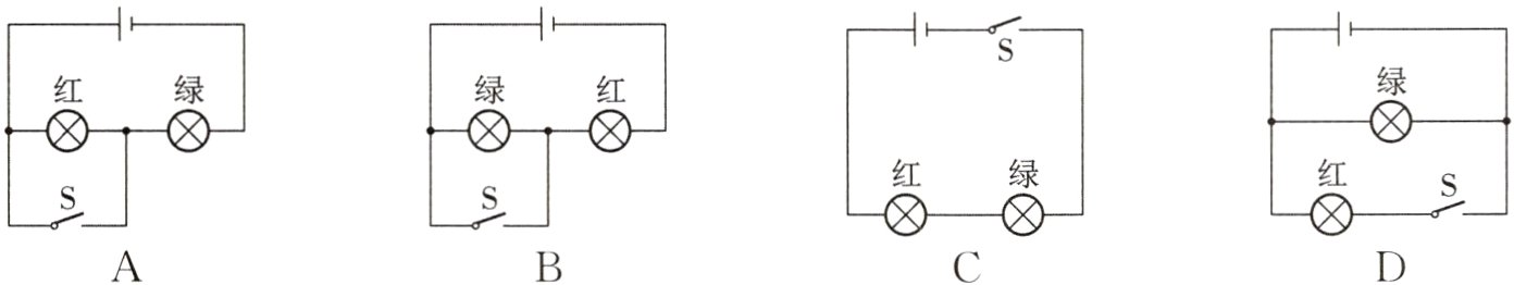 1.商场中随处可见的共享充电宝极大地方便了我们的生活。当充电宝位于充电仓内部时,开关S处于闭合状态,此时绿灯亮;当充电宝被取出借走时,开关S断开,此时绿灯和红灯都亮。选项中设计的电路图符合要求的是( )