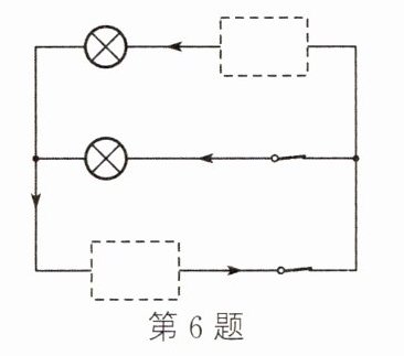 6.根据图中的电流方向,分别在虚线框中填入电流表或电池的符号,使两灯都发光。