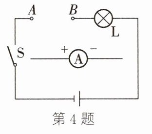 4.(芜湖无为期中)如图所示,要用电流表A接在AB间测量灯L的电流,应把电流表的“+”接线柱与________相连接,把“ - ”接线柱与________连接。(填“A”或“B”)