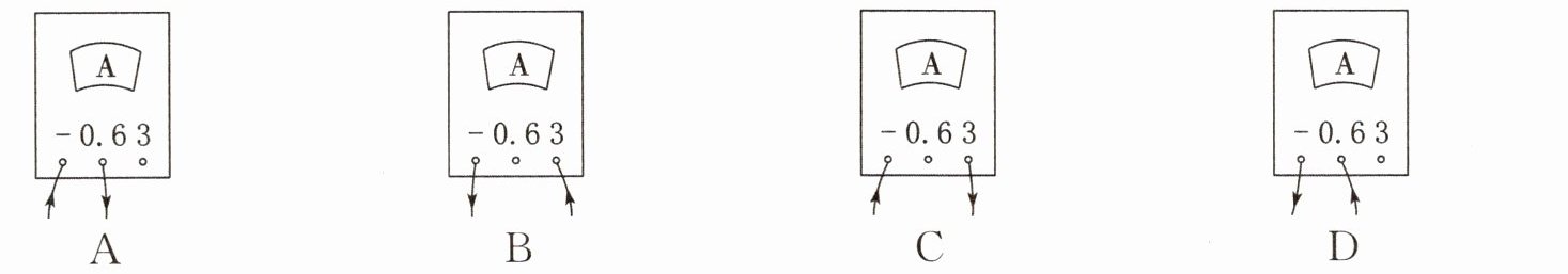 8.小红用电流表测量某电路中的电流,若电流的大小约为0.5A,则下列选项中选用的接线柱及通过接线柱的电流方向正确的是 ( )