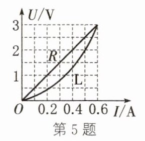 5. 如图所示为分别测量定值电阻R和小灯泡L两端电压和通过它们的电流后得到的U−I关系图线。由图可知,定值电阻R的阻值为________Ω;小灯泡L的阻值会随其两端电压的升高而逐渐变________,当其两端电压为2V时,其阻值为________Ω。