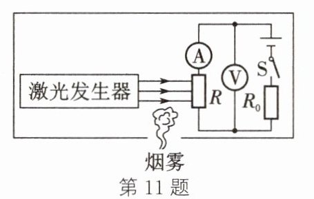 11.(2023.聊城)如图所示为列车上烟雾报警器的简化原理图。内装有一个激光发生器及带有一光敏电阻R的电路,其中电源电压恒定,R₀为定值电阻。有烟雾产生时,激光被烟雾遮挡而使光敏电阻的阻值发生变化,从而改变电路中的电流。当电路中的电流增大至某一数值时报警器开始报警。下列说法中正确的是 ( )