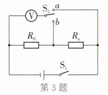 3.(安徽中考)如图所示的电路中,电阻R₀=12Ω。闭合开关S1,将单刀双掷开关S2掷于a 端,电压表示数为2.5V;将S2切换到b端,电压表示数为1.5V,则电阻R₁的阻值为__________Ω。