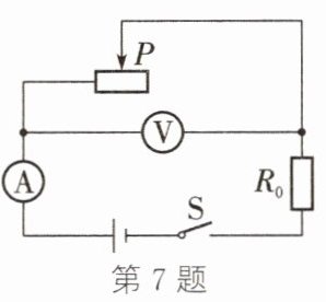 7.如图所示的电路,电源电压保持不变,R₀为定值电阻。闭合开关S,当滑动变阻器的滑片P 在某两点之间来回滑动时,电流表示数的变化范围是0.5~1.5A,电压表示数的变化范围是3~6V,则电源电压U=__________V,电阻R₀=__________Ω。