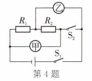 4.如图所示,电源电压恒定。当开关S₁、S₂闭合,甲、乙两表均为电压表时,两表示数之比U甲:U乙=5:2;当开关S₁闭合、S₂断开,甲、乙两表均为电流表时,甲、乙两表的示数之比I甲:I乙=__________。